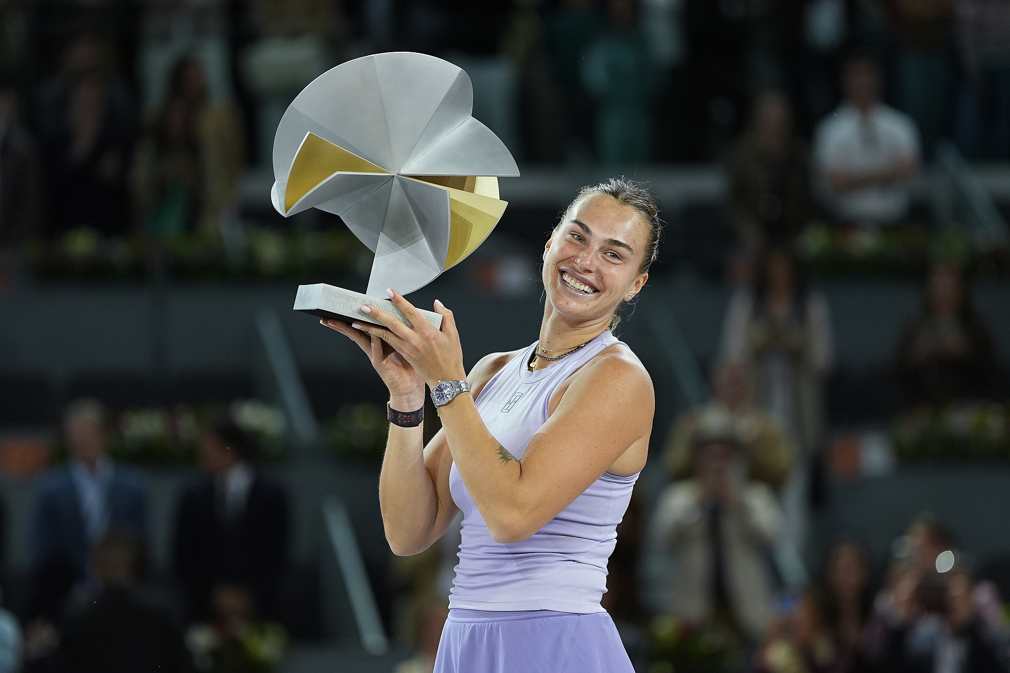 Aryna Sabalenka of Belarus poses with the championship trophy after defeating Coco Gauff of the USA in the women's singles final at the WTA Madrid Open in Madrid, Spain, May 3, 2025. /VCG