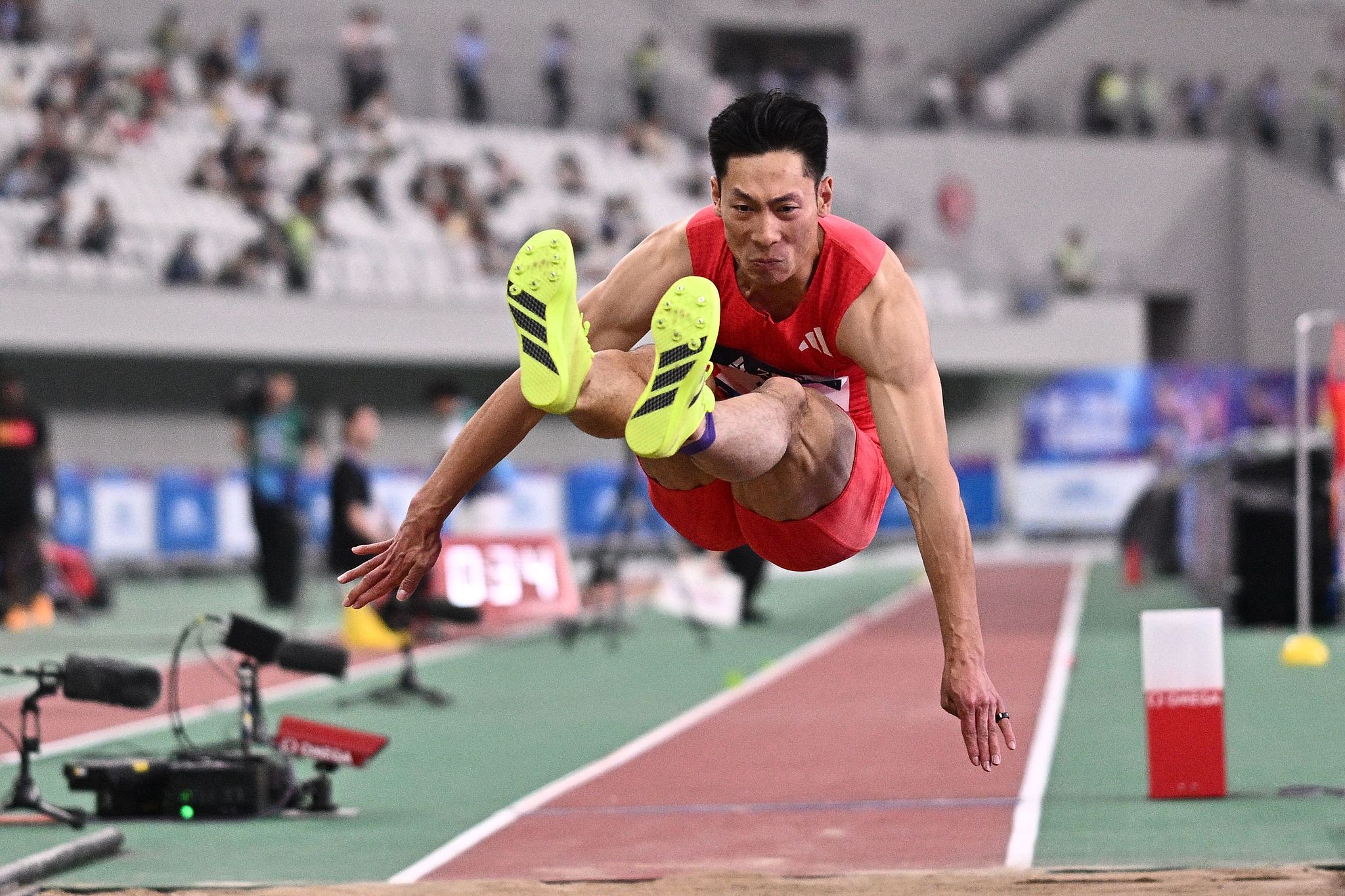 Shi Yuhao of China wins the men's long jump gold medal at the World Athletics Diamond League competition in Shaoxing, east China's Zhejiang Province, May 3, 2025. /VCG