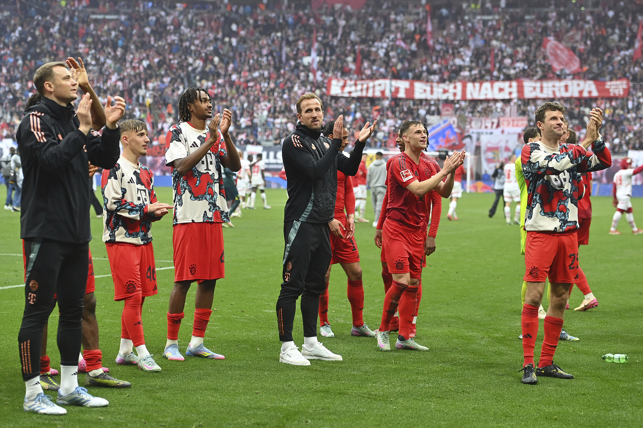 Bayern Munich's players applaud their supporters in the crowd after being held to a 3-3 draw by RB Leipzig in a German Bundesliga match at the Red Bull Arena in Leipzig, Germany, May 3, 2025. /VCG