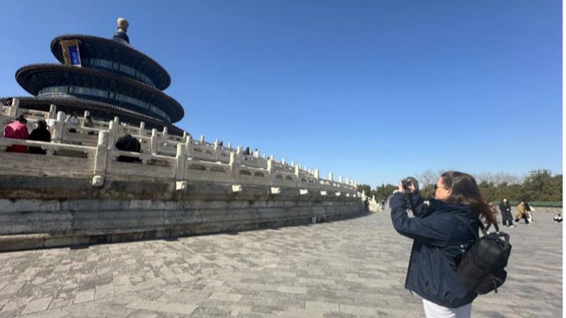 A European tourist takes photos while visiting Tiantan (Temple of Heaven) Park in Beijing, capital of China, March 20, 2024. /Xinhua
