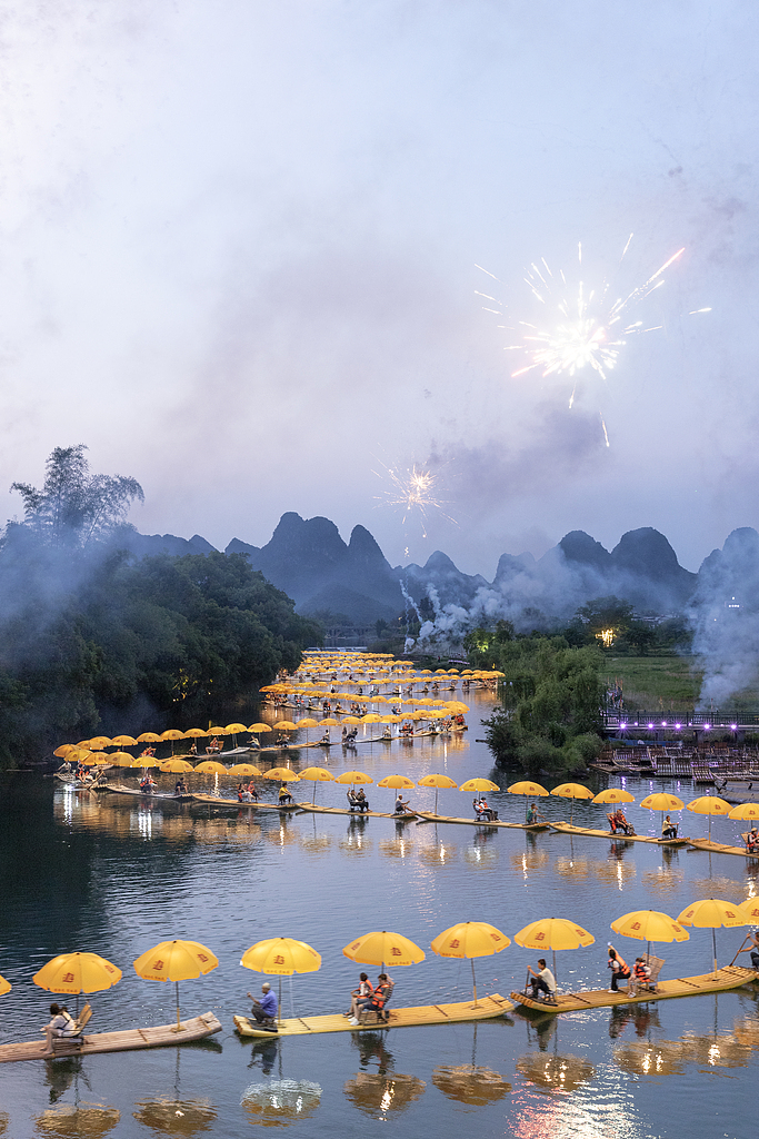 A "dragon boat" performance is staged in Yangshuo, where a chain of riverboats resembling a giant dragon glides through the water against the backdrop of karst peaks on May 4, 2025. /VCG