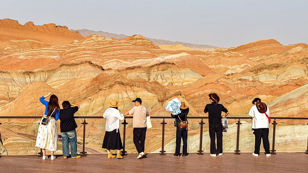 Visitors soak up the scenery at Zhangye Danxia National Geological Park in Gansu, China on May 1, 2025. /VCG
