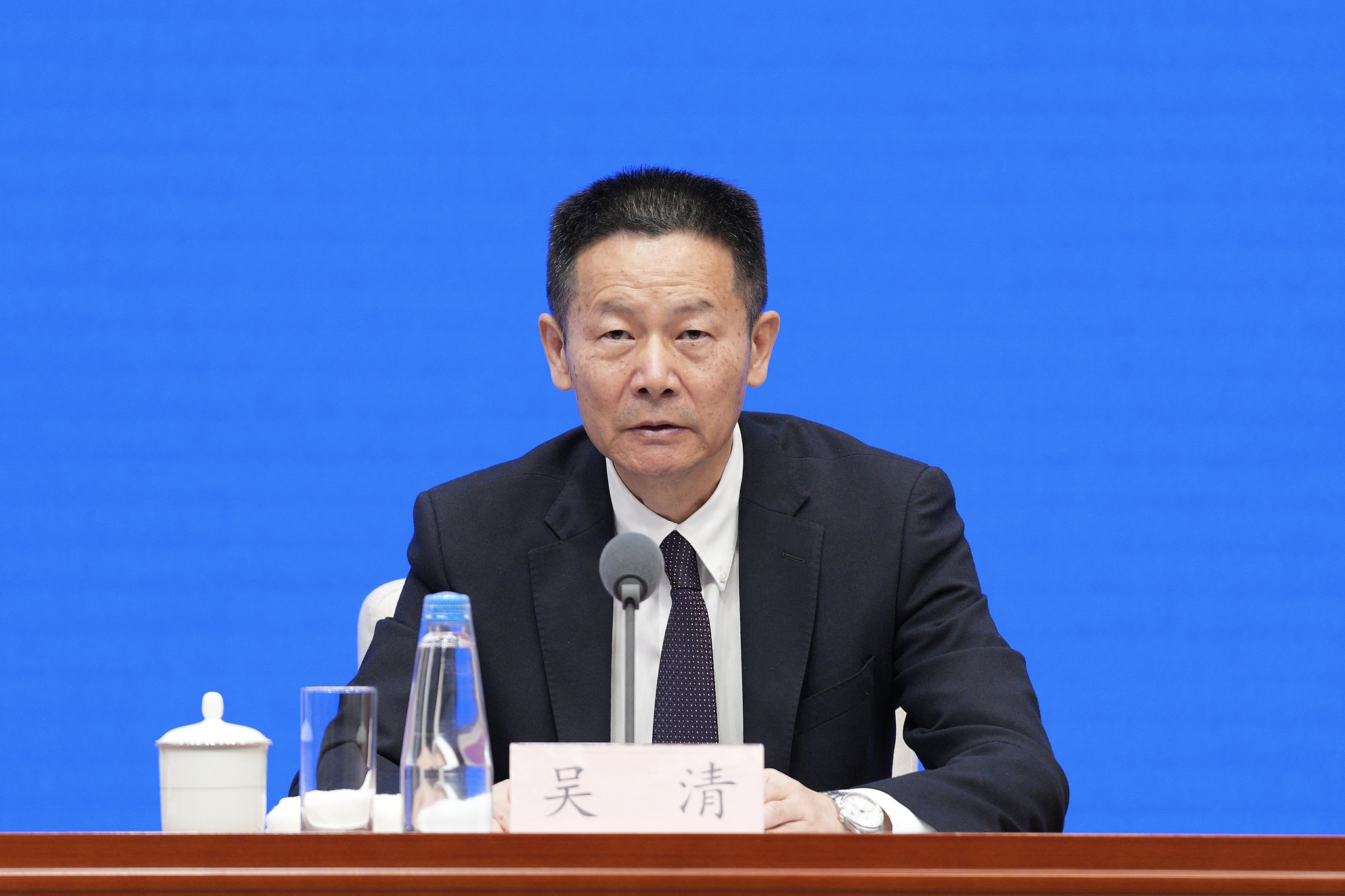 Wu Qing, chairman of the China Securities Regulatory Commission, addresses the press conference on the financial policy package aimed at stabilizing markets and expectations, May 7, 2025. /VCG