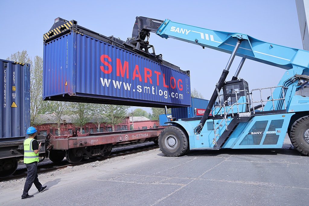 A worker loads a container onto a China-Europe freight train from Beijing to Moscow in Beijing, China, April 16, 2025. /VCG