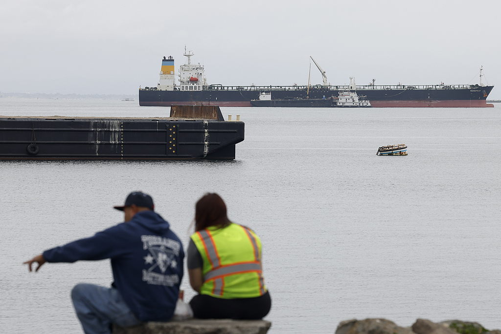 People look out at nearby cargo ships at the Port of Los Angeles in Los Angeles, California in the US, May 6, 2025. The Trump administration's decision to subject imports to a minimum 10 percent tariff has halted roughly a third of the traffic at the port. /VCG