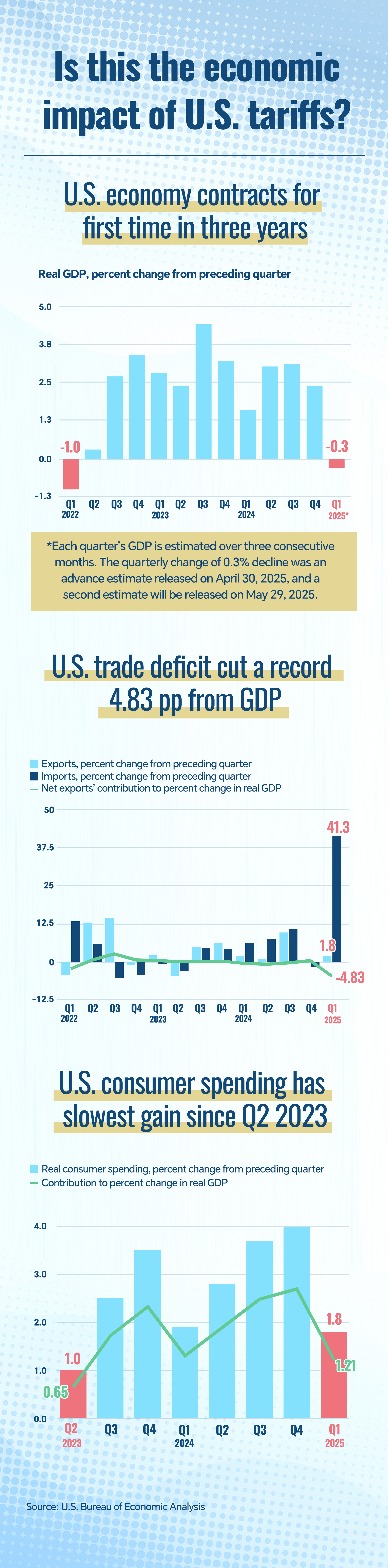The U.S. economy shrank by 0.3 percent in the first quarter of this year, which is the first contraction since the start of 2022. The country's trade deficit jumped to a record $140.5 billion in March, and the trade gap in the first quarter cut a record 4.83 percentage points from GDP. Its first-quarter consumer spending has the slowest gain of 1.8 percent since the second quarter of 2023.