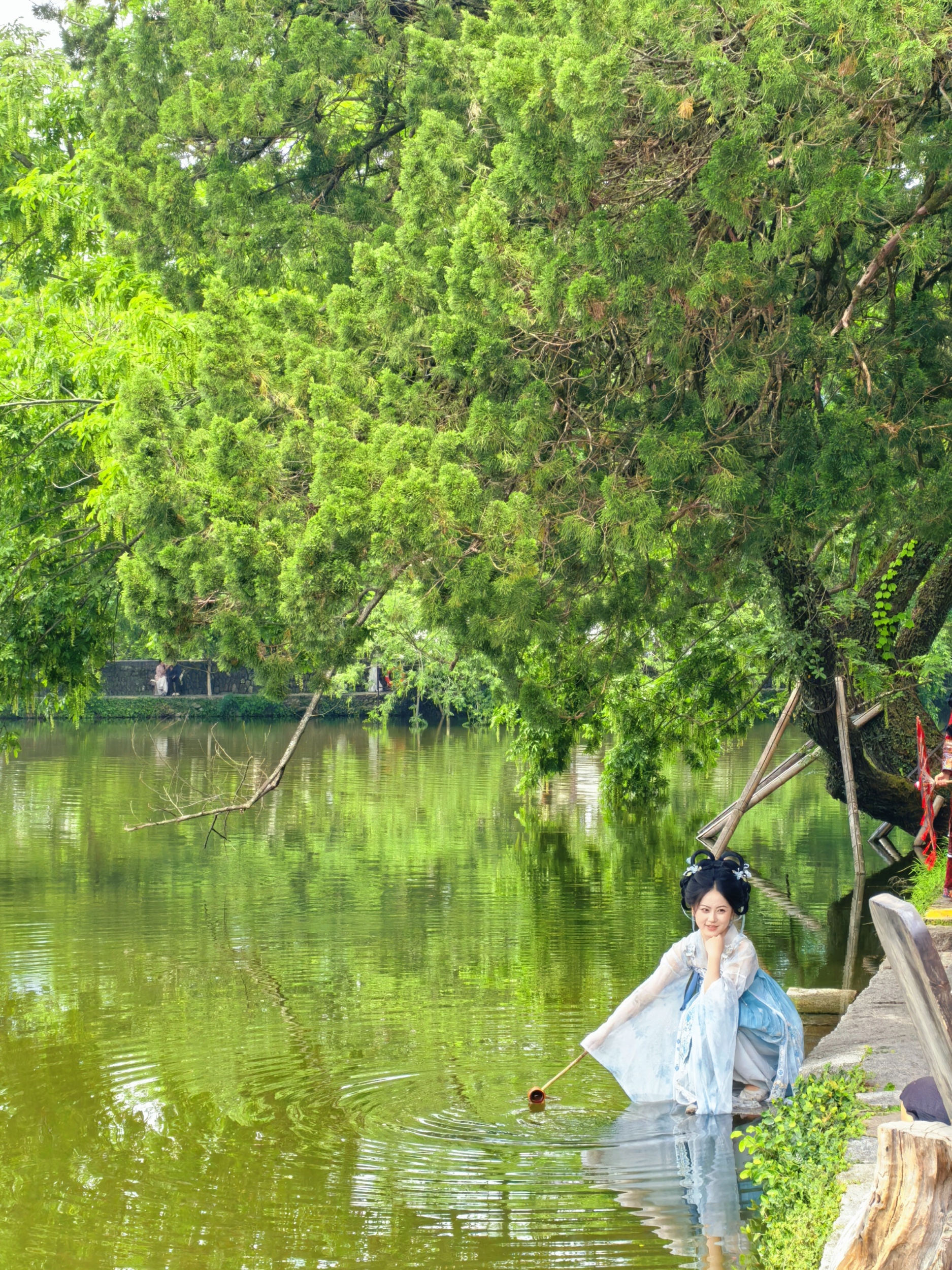 A tourist in traditional Chinese attire poses for a photo at Hongcun Village, Yixian County, Huangshan City, east China's Anhui Province, May 4, 2025. /CGTN