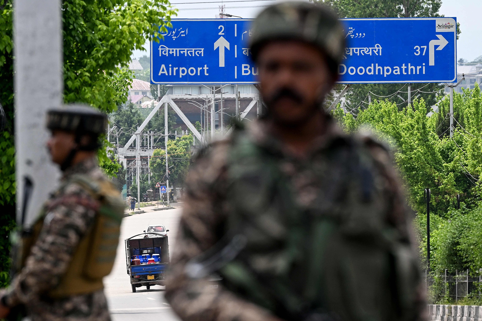 Indian paramilitary personnel stand guard along a street leading to the international airport in Srinagar, May 10, 2025. /VCG