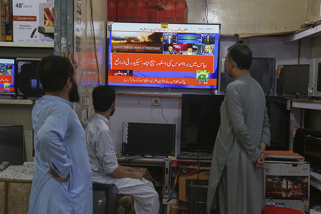 Shopkeepers watch a news channel telecasting ongoing military tension between Pakistan and India, at a shop in Peshawar, Pakistan, May 10, 2025. /VCG