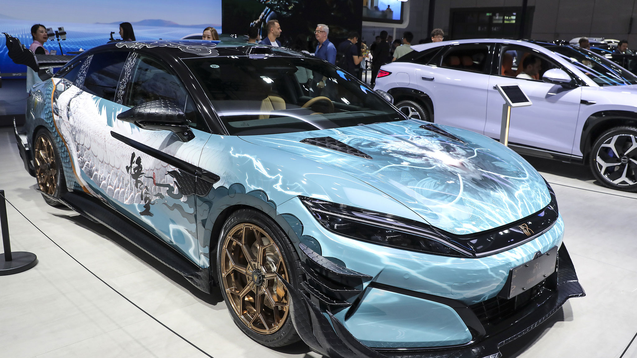 A BYD Han EV wrapped in "Black Myth: Wukong" livery is displayed at a car show in Shanghai, China, April 24, 2025. /VCG