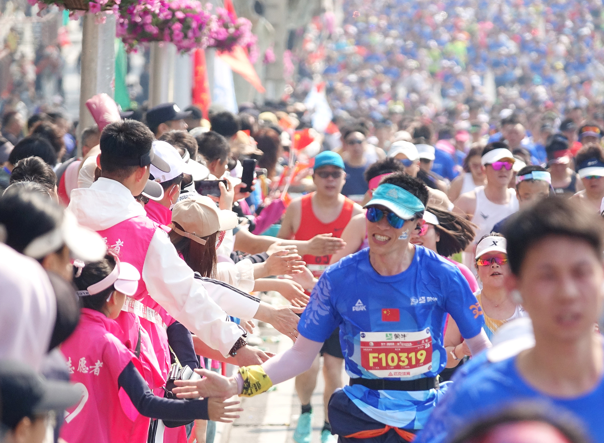 Runners interact with volunteers at the 35th Dalian Marathon, Dalian, northeast China's Liaoning Province, May 11, 2025. /VCG