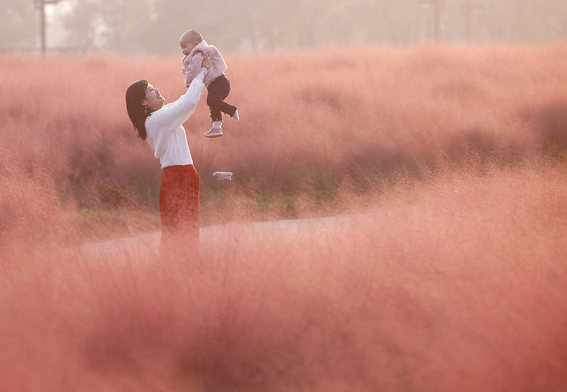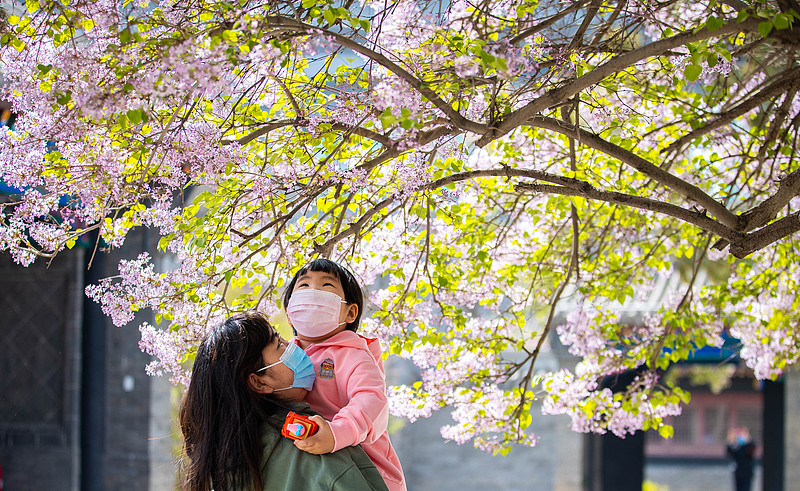 A mother holds her child amid a sea of pink blossoms at Daming Palace in Xi'an City, Shaanxi Province. /VCG