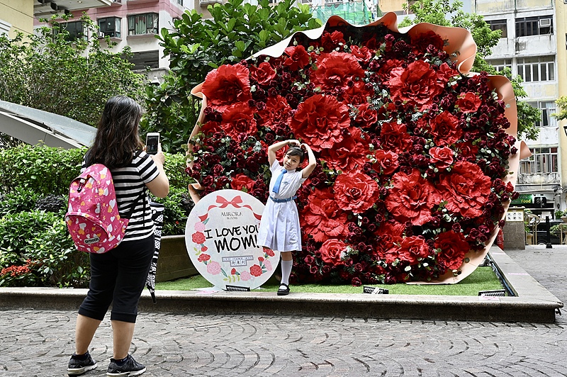 A mother takes photos of her daughter in front of an installation featuring flowers for Mother's Day in Hong Kong, China. /VCG
