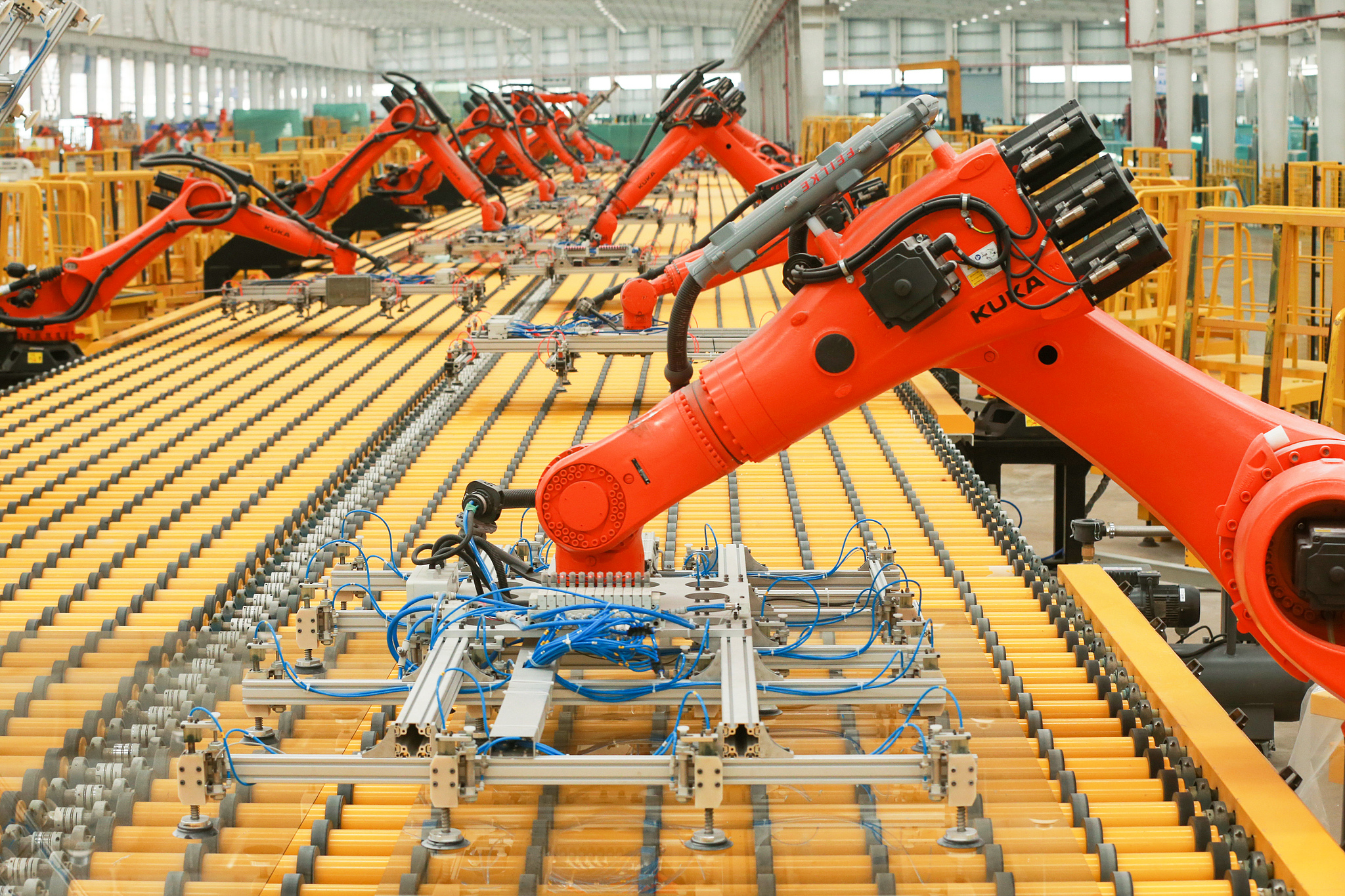 Robotic arms automatically grabbing glass sheets for stacking in the glass production workshop in southwestern China's Guizhou Province, April 8, 2025. /VCG