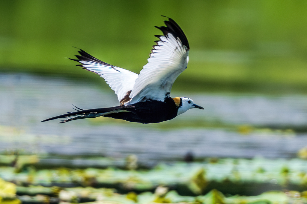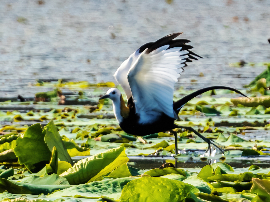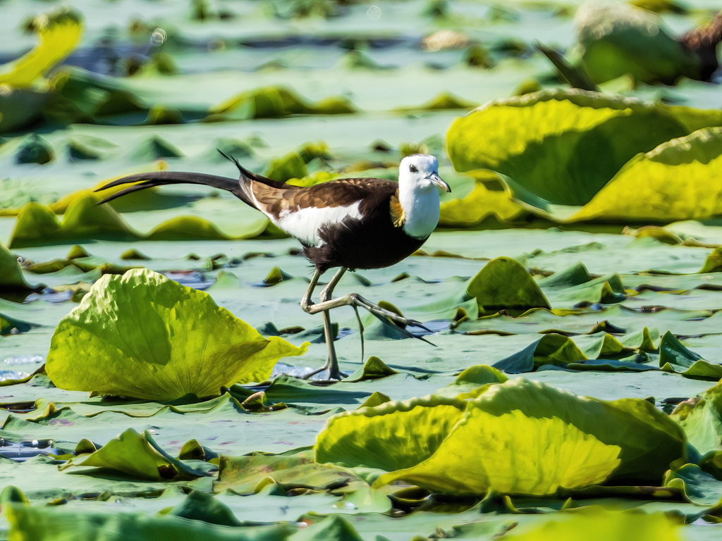 Known as "fairies of the ripples," pheasant-tailed jacanas have settled at a lotus pond in Xianghu Wetland Park in Nanchang, Jiangxi Province. Also referred to as "water phoenixes," these birds are under second class national protection in China. Their arrival to breed and raise offspring at the pond highlights the stable and improving ecological conditions of Xianghu Lake.