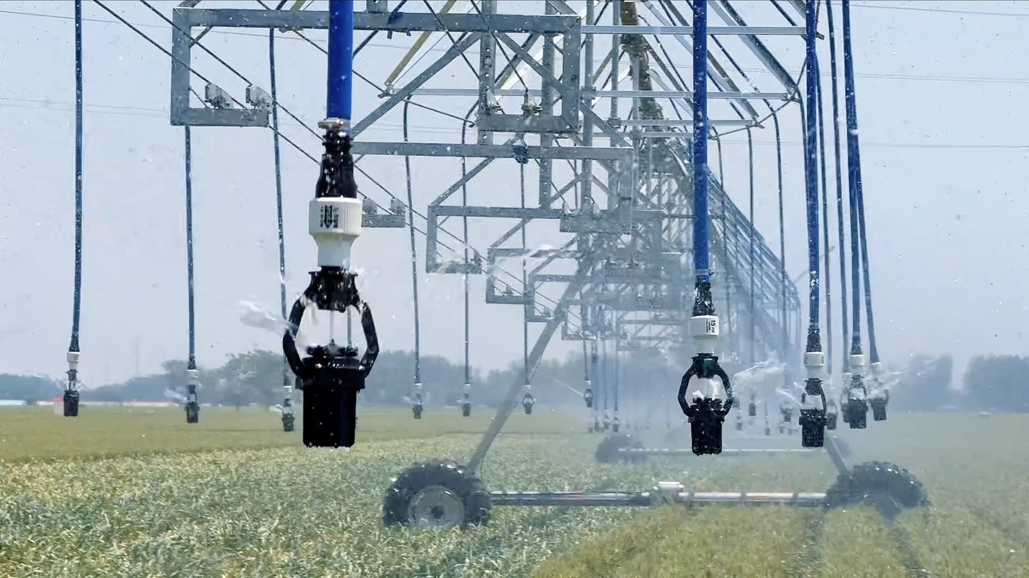 May is a crucial month for winter wheat filling, but a severe drought has gripped central China's Henan Province. In Qixian County, smart irrigation is helping farmers fight extreme weather. A large sprinkler on rails moves slowly, spraying water, fertilizer and pesticides at once. A rotating sprinkler with corner arms reaches every edge of the wheat fields. Fine droplets fall evenly on wheat during its grain-filling stage. These smart systems aim to protect crops and ensure a strong harvest. Henan province is one of the major grain production areas in China, which produces one fourth of the country's wheat output.