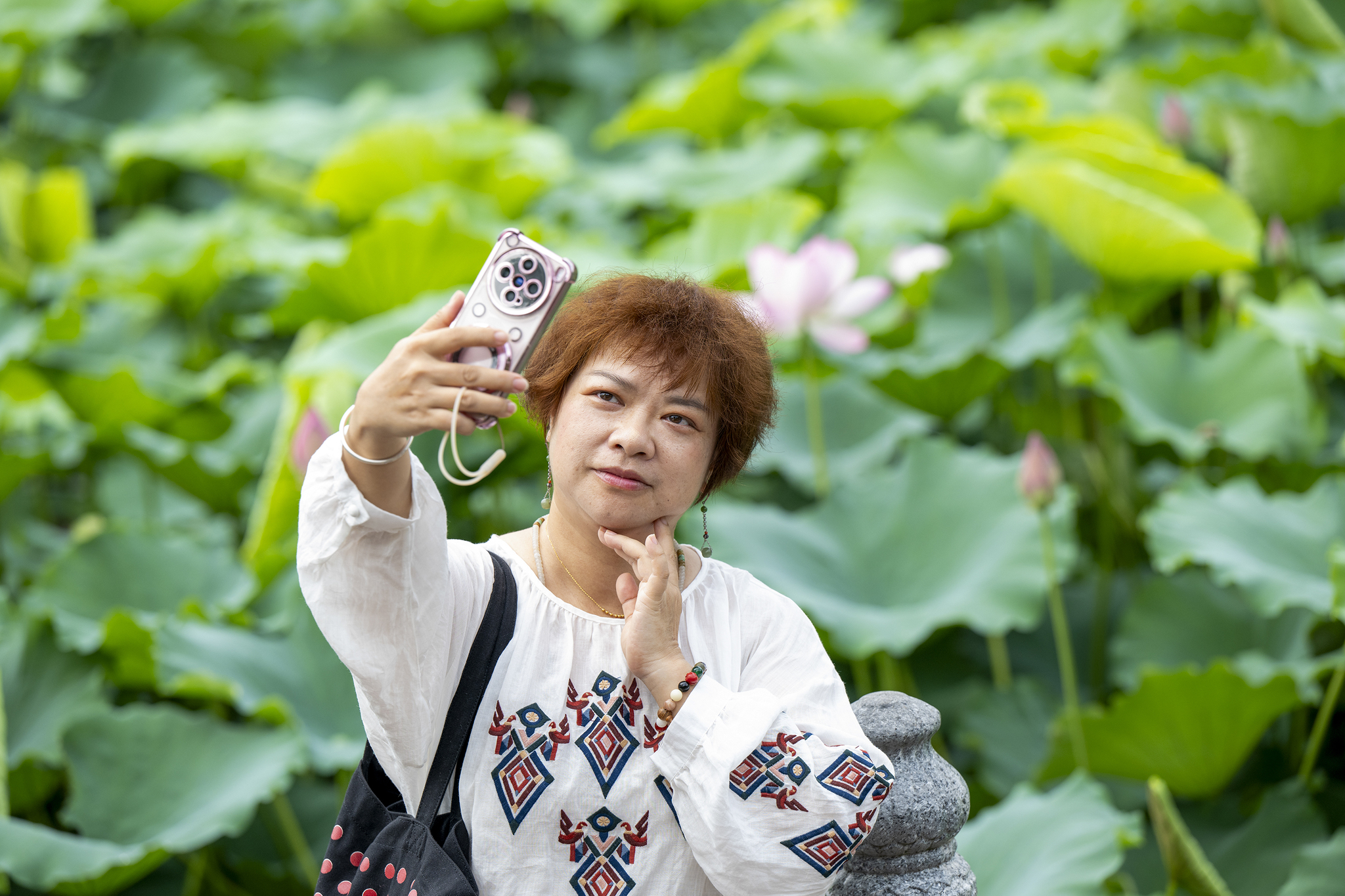 A visitor takes selfie with blooming lotus flowers at Pantang Park in Wuzhou, Guangxi Zhuang Autonomous Region on May 18, 2025. /VCG