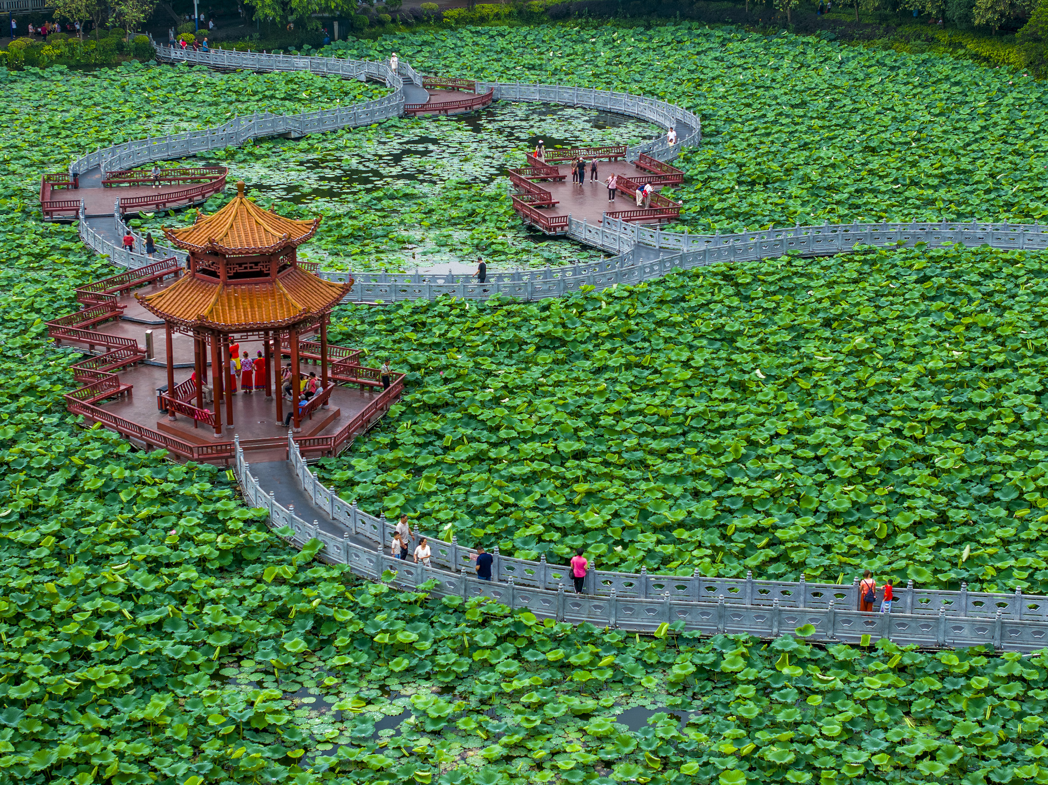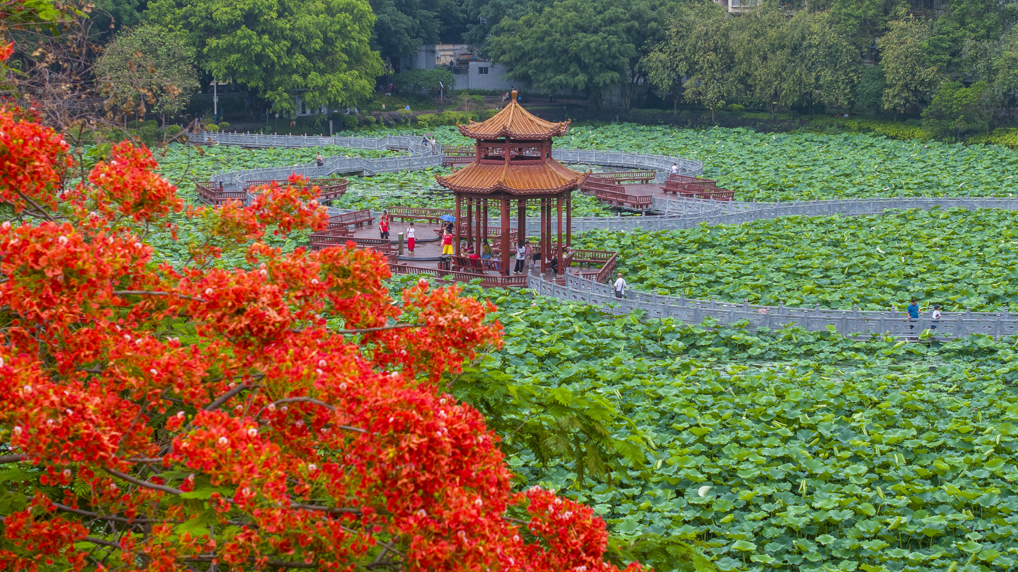 Lotus flowers draw visitors to soak in the refreshing beauty of nature at Pantang Park in Wuzhou, Guangxi Zhuang Autonomous Region on May 18, 2025. /VCG