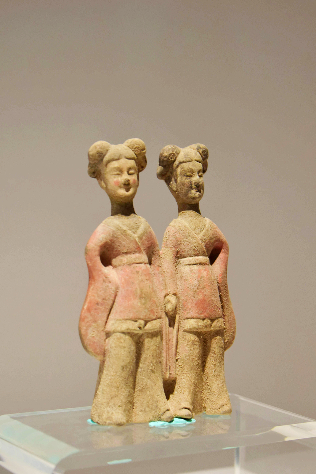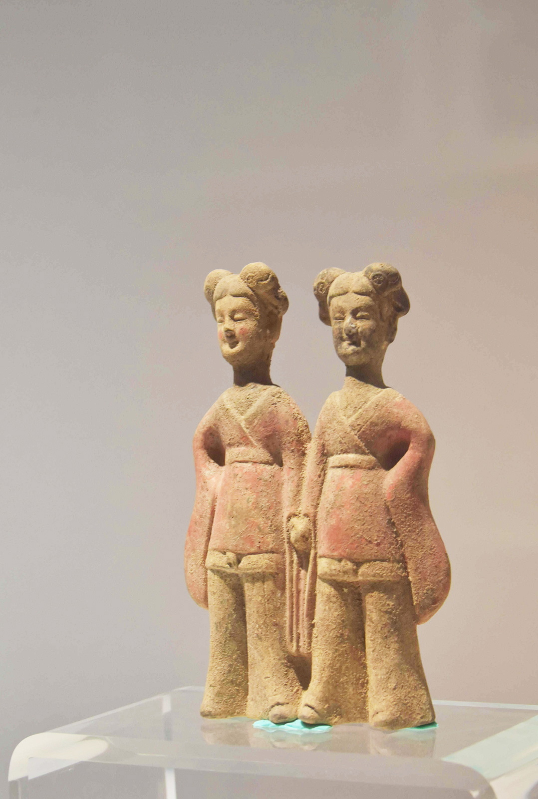 A painted pottery figurine of a pair of women standing hand-in-hand is seen on display at the Luoyang Museum in Henan Province. /IC