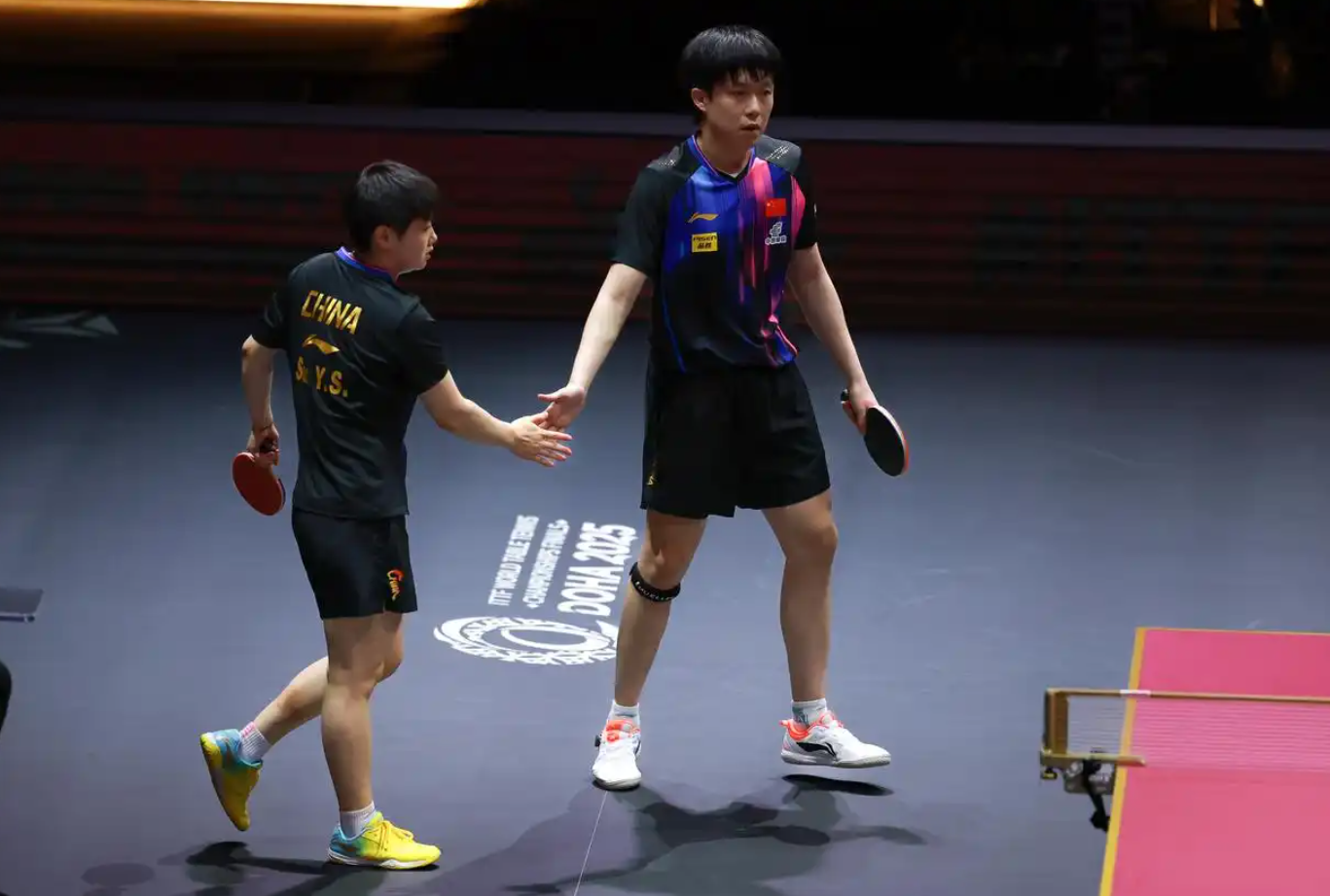 Wang Chuqin (R) and Sun Yingsha of China hi-five each other in the mixed doubles match against Hugo Calderano and Bruna Takahashi of Brazil at the International Table Tennis Federation (ITTF) World Table Tennis Championships Finals in Doha, Qatar, May 19, 2025. /Xinhua