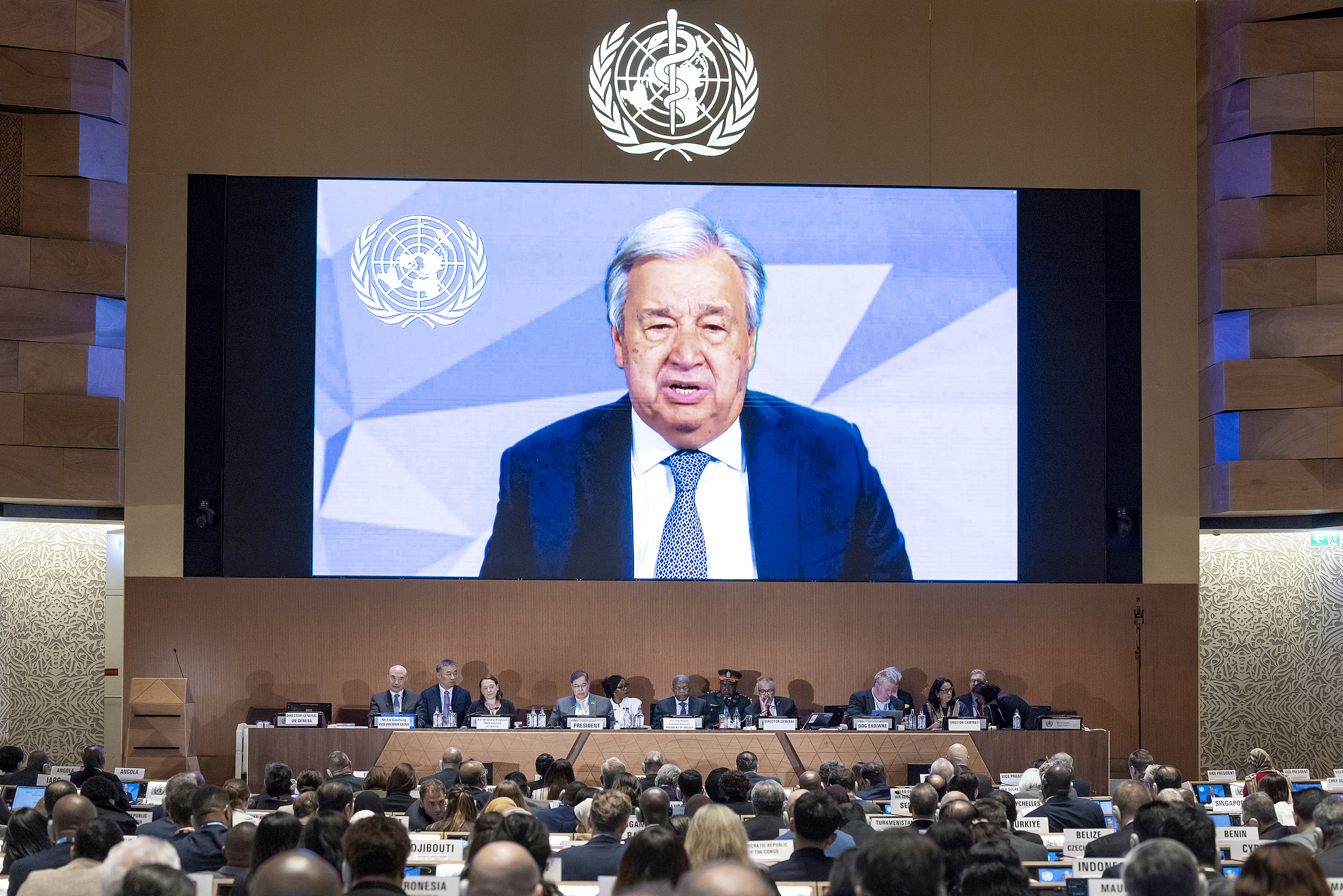 United Nations Secretary-General Antonio Guterres delivers a statement via a video call during the 78th WHA in Geneva, Switzerland, May 20, 2025. /VCG