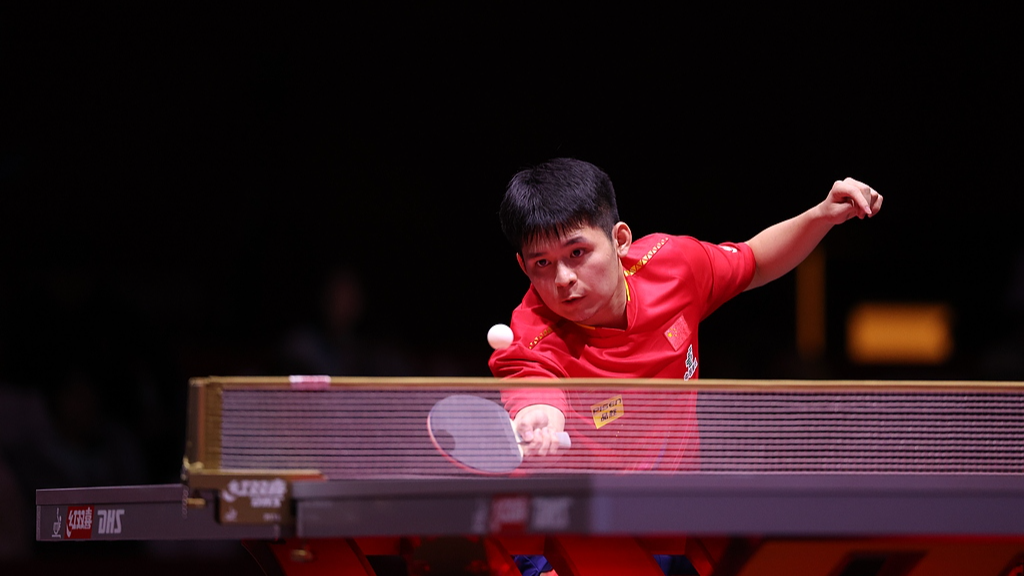 Lin Shidong hits a shot against Sweden's Kristian Karlsson in their men's singles round of 32 match at the International Table Tennis Federation (ITTF) World Championships in Doha, Qatar, on Wednesday, May 21, 2025. /VCG