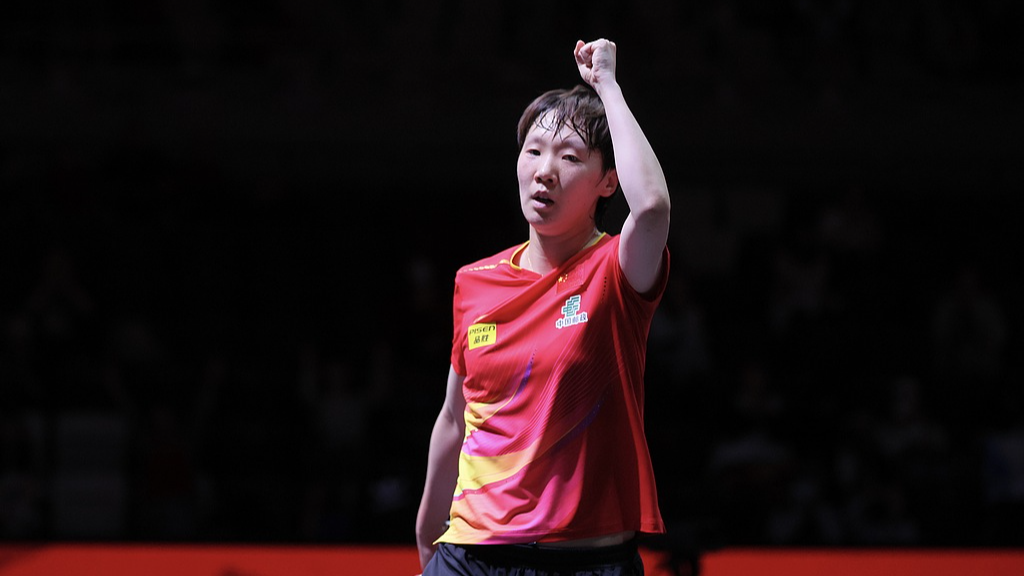Wang Manyu celebrates after defeating Germany's Ying Han to reach the women's singles round of 16 at the International Table Tennis Federation (ITTF) World Championships in Doha, Qatar, on Wednesday, May 21, 2025. /VCG