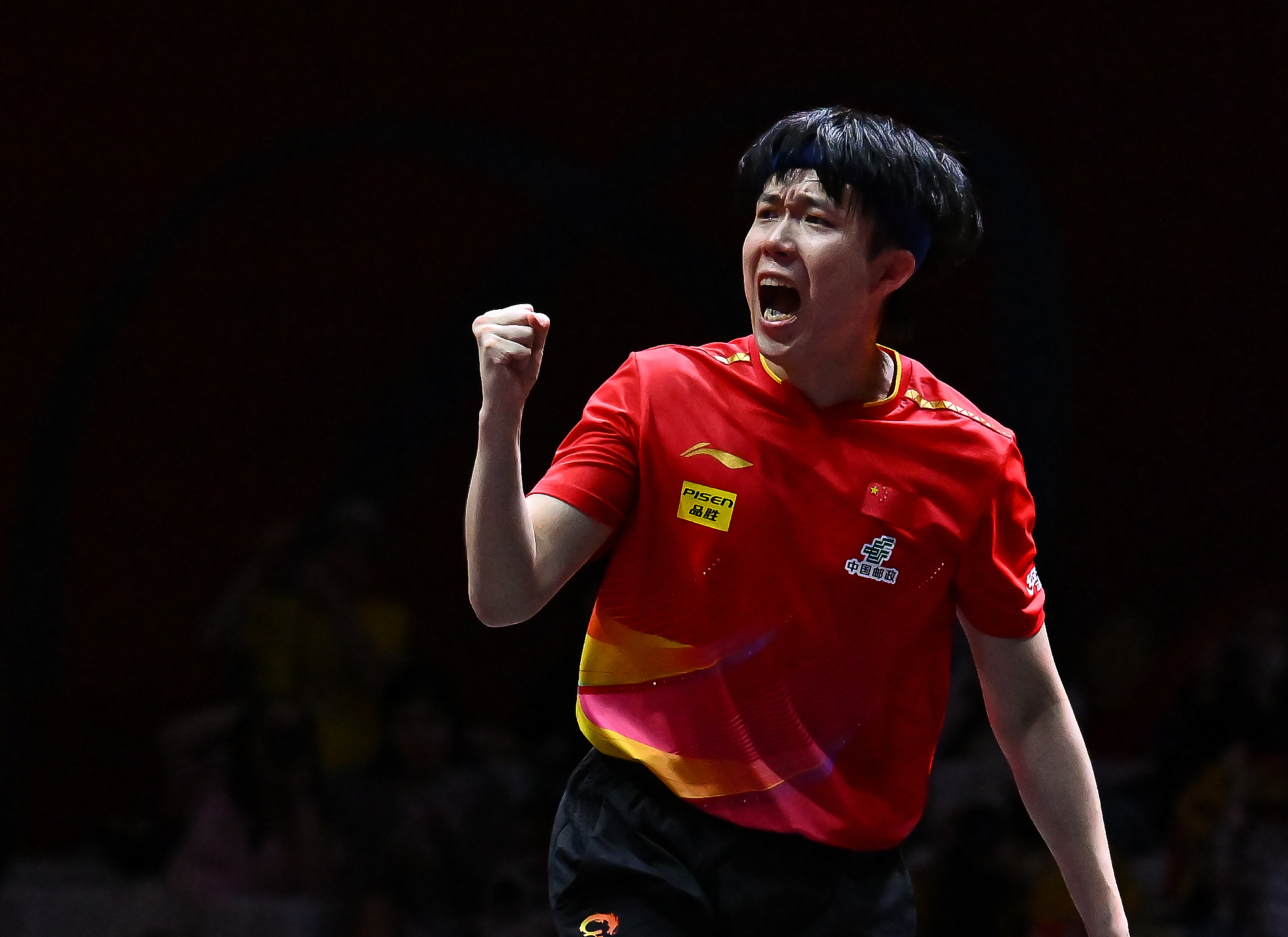 Wang Chuqin of China reacts after scoring a point against Simon Gauzy of France in a men's singles round of 16 match at the International Table Tennis Federation (ITTF) World Championships Finals in Doha, Qatar, May 22, 2025. /VCG