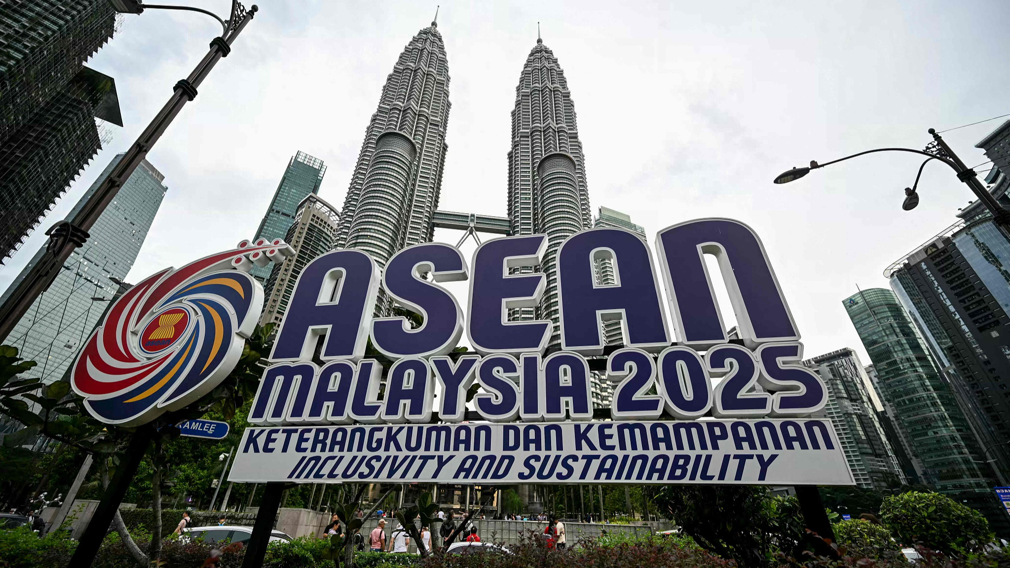 The ASEAN logo in front of the Petronas Twin Towers in Kuala Lumpur, Malaysia, May 15, 2025. /CFP