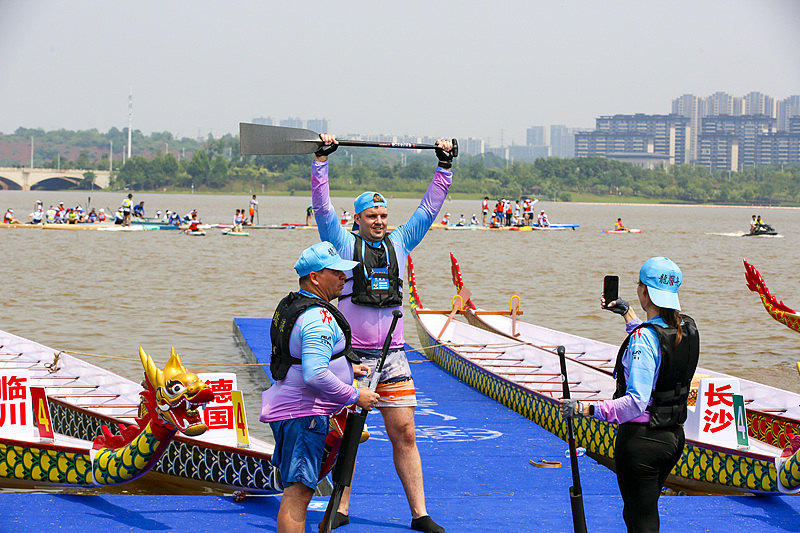 Team members celebrate after the Nanchang International Dragon Boat Race in Nanchang, Jiangxi Province, May 24, 2025. /VCG