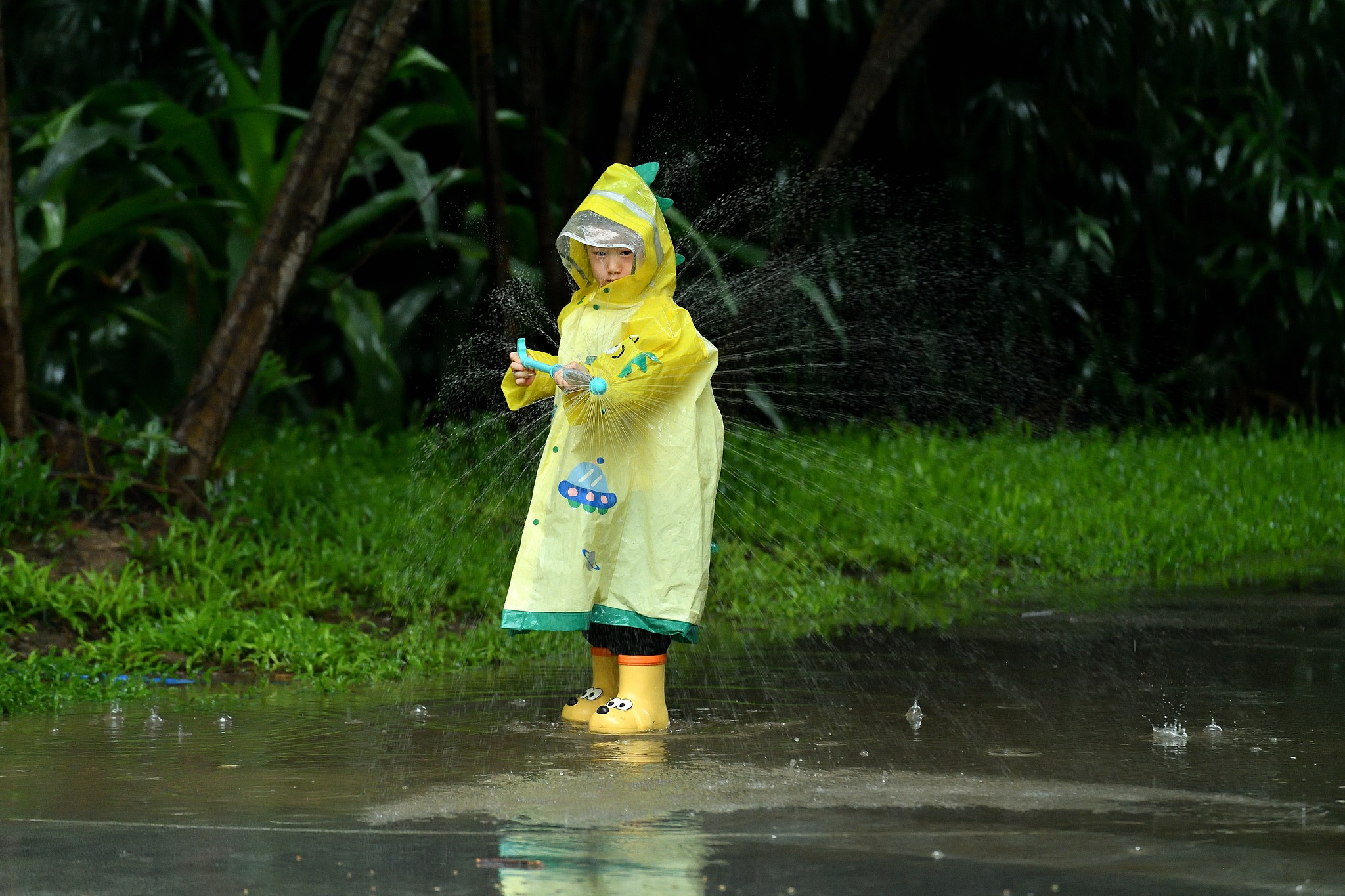 A child plays with a water gun as the rain begins to ease in Guangzhou City, Guangdong Province, south China, May 23, 2025. /VCG