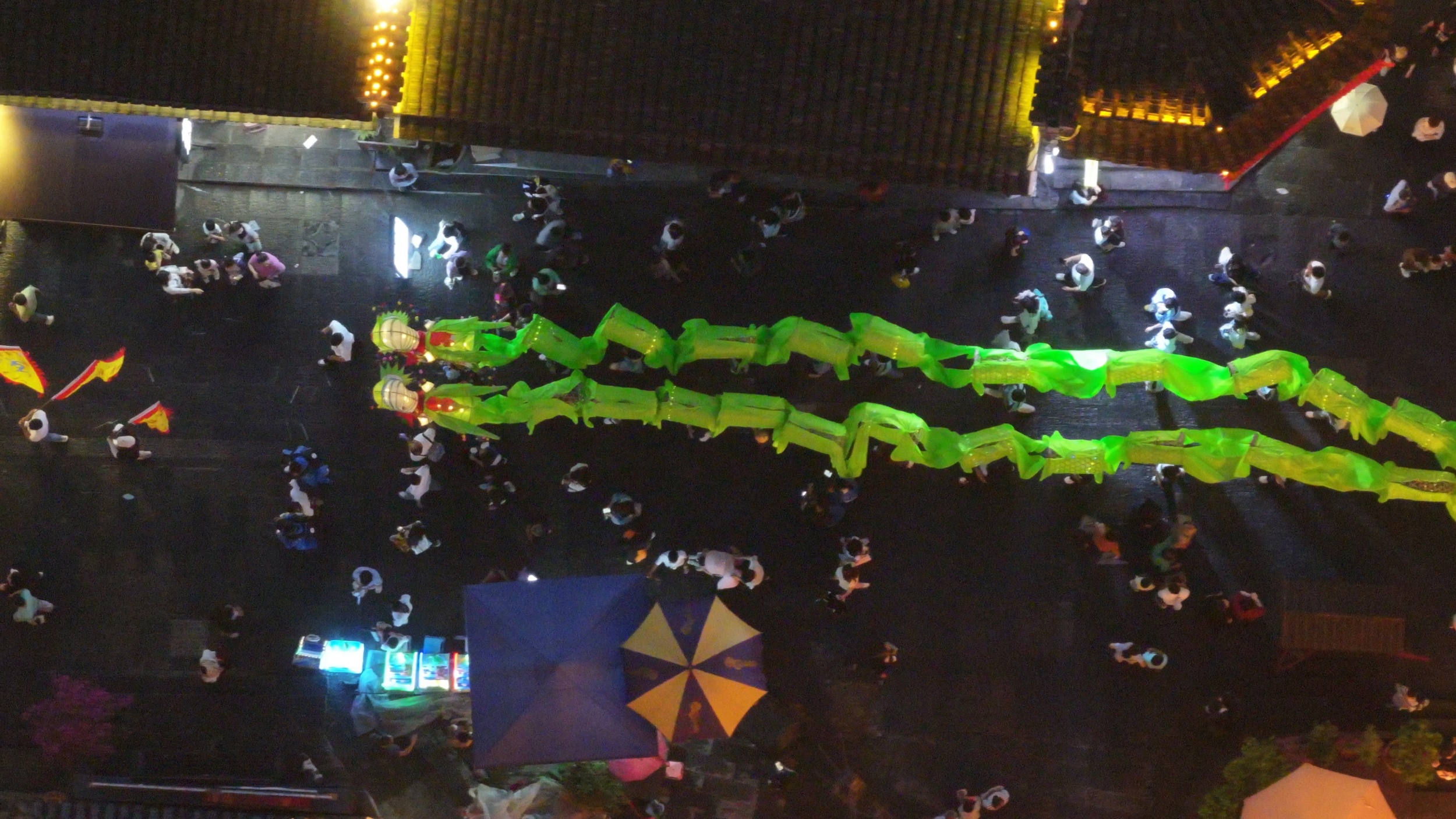 As the dragon boats entered the water, 500 drones formed words such as "Dragon Soaring over Jinjiang River" and "Bijiang Welcomes You" in the night sky over Tongren Ancient City.
