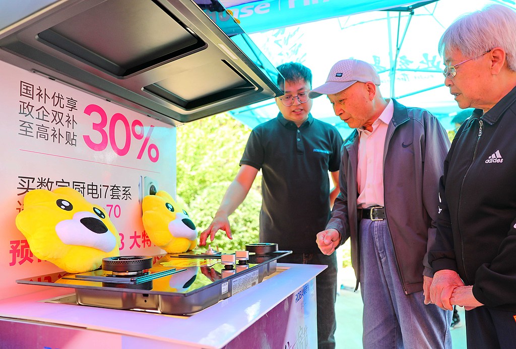 A merchant introduces household appliances and the subsidies under the trade-in policy to residents in a community in Haigang District, Qinhuangdao, Hebei Province, May 24, 2025. /VCG