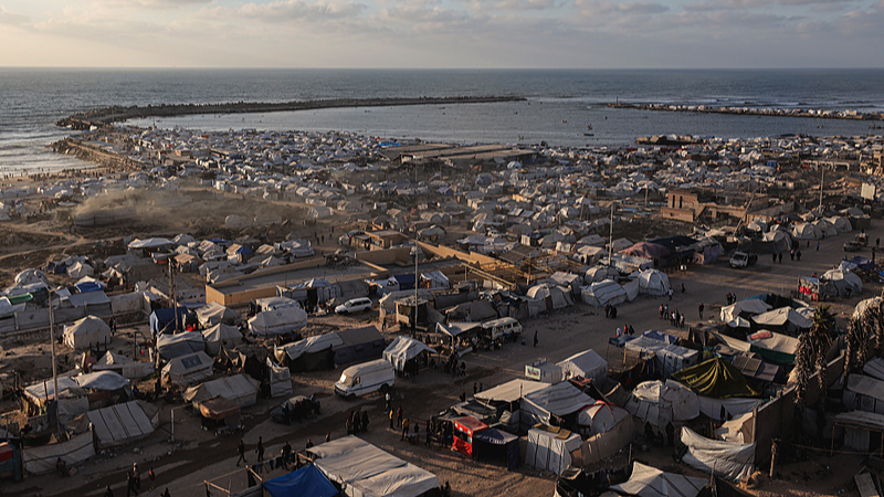 Palestinians living in makeshift tents on the coast struggle amid starvation and Israeli blockade in Gaza Strip, Palestine, May 28, 2025. /VCG