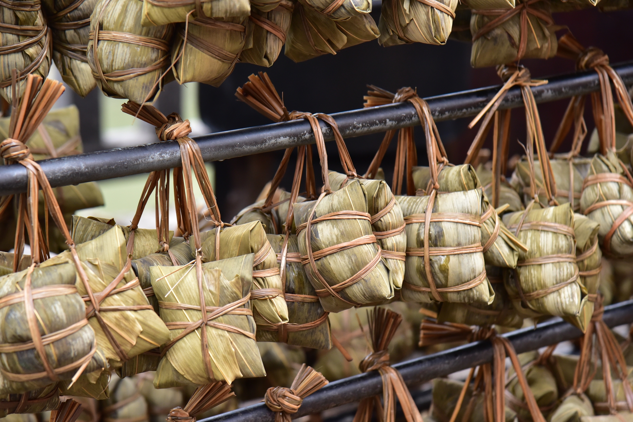 The roots of this tradition trace back to the 1930s, when creator Ye Chao revolutionized the dish by refining its ingredients and seasonings. His innovative method gained local fame and set the standard for what became a celebrated local craft. To make zongzi, two bamboo leaves are folded into a funnel shape and filled with glutinous rice, mung beans, pork belly, salted egg yolk, and then more mung beans and rice layered on top. The pyramid is carefully wrapped with additional leaves and tied tightly using stems of Dongguan's special Cyperus malaccensis.