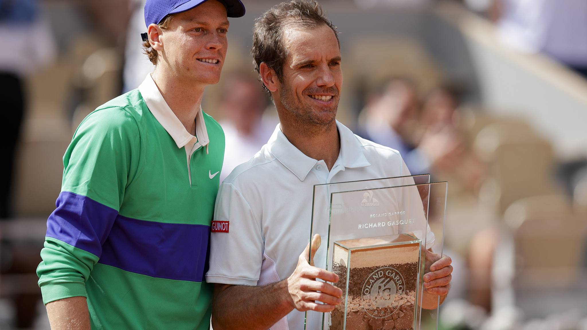Jannik Sinner of Italy poses with the retiring Richard Gasquet (R) of France after their men's singles second round match at the French Open at Roland-Garros in Paris, France, May 29, 2025. /VCG