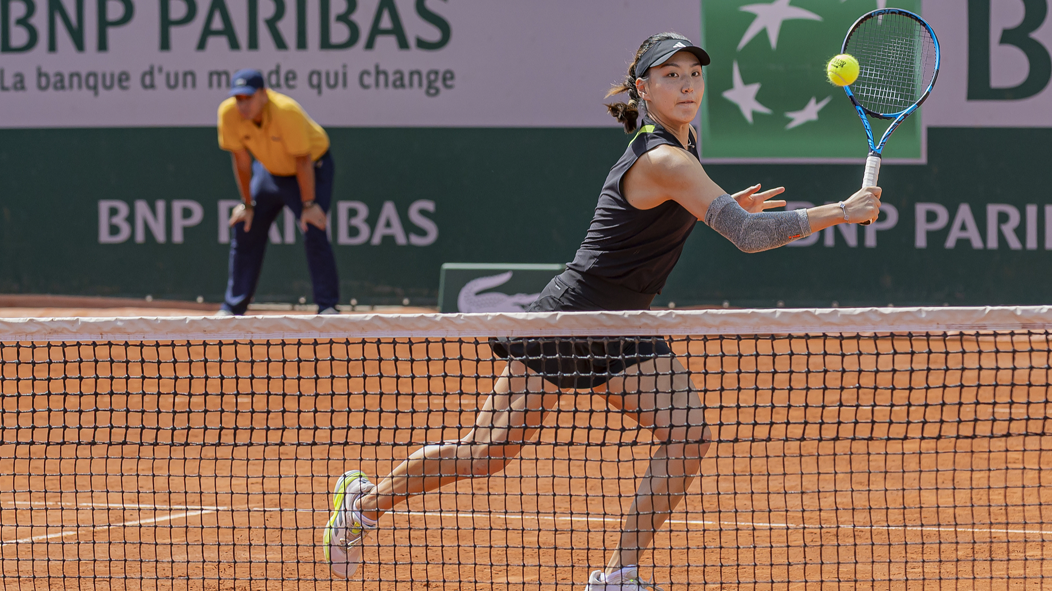 China's Wang Xinyu hits a shot in her women's doubles first round match alongside compatriot Zheng Saisai against Russia's Irina Khromacheva and Hungary's Fanny Stollar at the French Open at Roland-Garros in Paris, France, May 29, 2025. /VCG