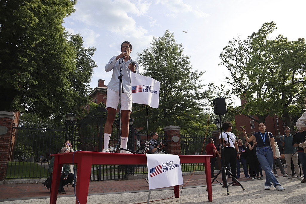 A member of the Harvard University class of 2026, speaks at a protest against U.S. President Donald Trump's recent sanctions targeting Harvard in front of the Science Center Plaza in Cambridge, Massachusetts, the U.S., May 27, 2025. /CFP