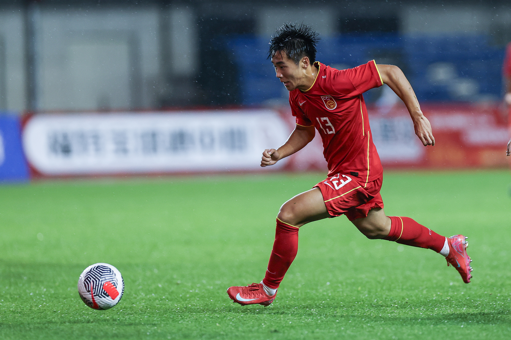 Shuai Weihao of China controls the ball against Vietnam in a Chinese Football Association (CFA) Under-16 International Tournament match in Hohhot, north China's Inner Mongolia Autonomous Region, May 30, 2025. /VCG