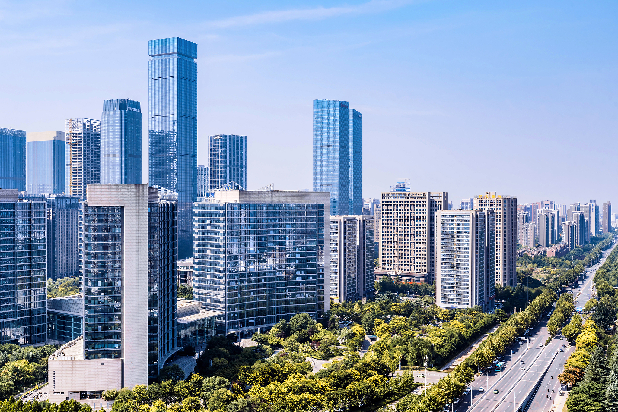 A high-angle view of the skyline and streets of the high-tech CBD area in Xi'an, Shaanxi Province, China. /VCG