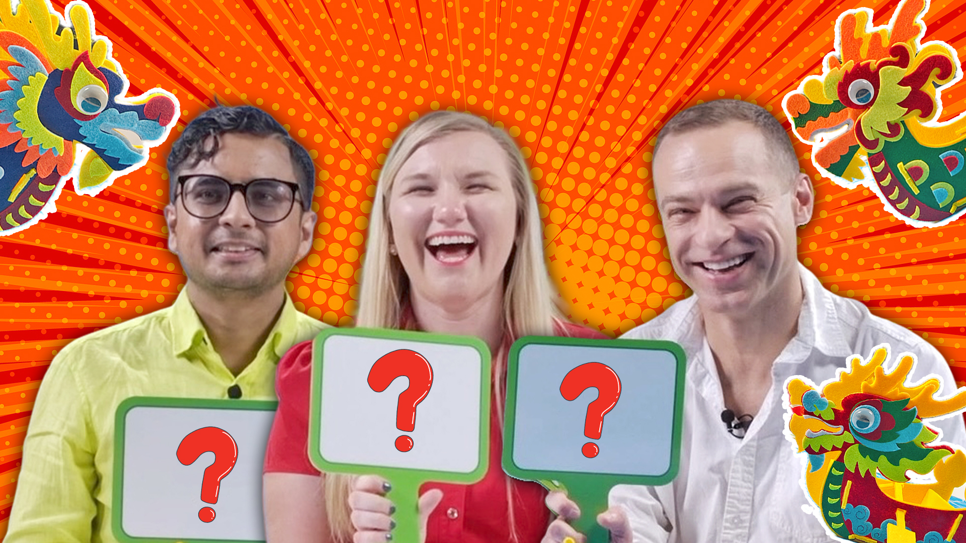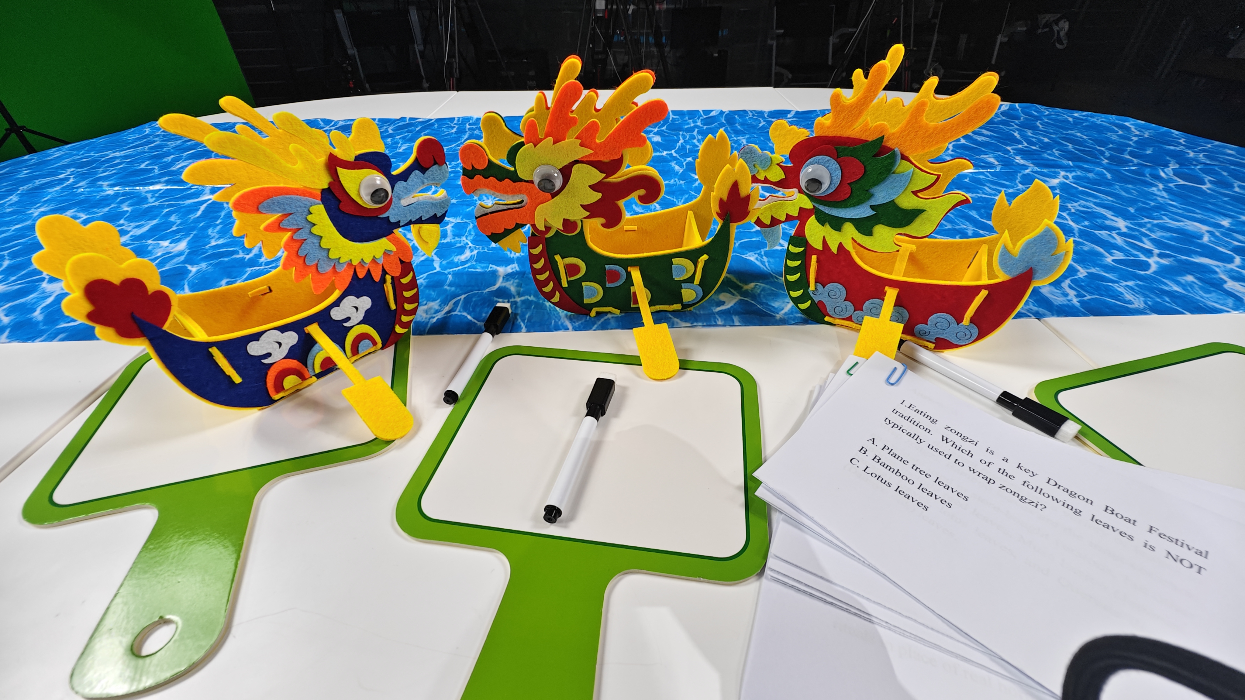 The studio is set, the answer boards are ready, and the colorful "dragon boats" are all lined up for their bold captains, CGTN reporters Rachel Weiss, Wendyl Martin and Sergey Gordeev in "Dragon Boat Festival – Row & Know!" /CGTN