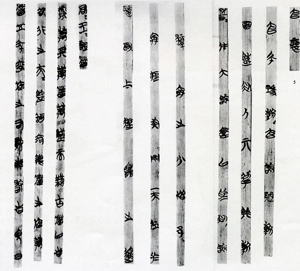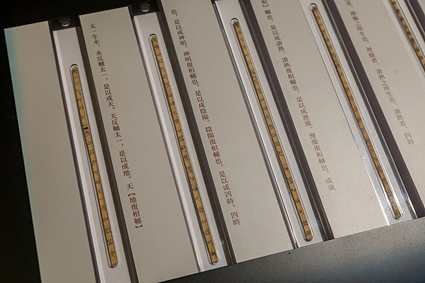 Part of the Guodian Chu Slips, unearthed in October 1993 in the Guodian tombs in Jingmen, Hubei Province, at Hubei Museum. /CFP