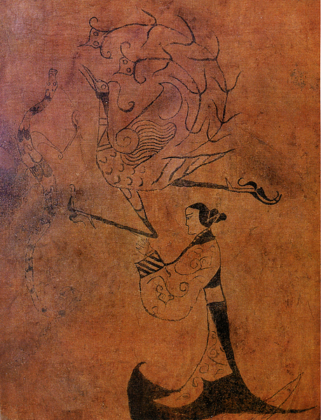 Archeological findings are in conformity with Qu Yuan's artistic rendering of the auspicious bird. Across the vast region that used to be under Chu’s control, the phoenix was believed to be a guide for souls between life and heaven. By far the most stunning phoenix image that has survived from the Chu kingdom is the "Silk Painting of Figures with Dragon and Phoenix," unearthed in 1949 from a Chu tomb in Changsha, Hunan Province. It is painted with ink and color on plain brown silk, featuring a solemn woman who is likely the tomb's owner, a soaring phoenix and a rising dragon. Experts are in general agreement that the painting is a "soul banner." Painted with the image of the deceased, it was believed that the artifact could lead the way to heaven for the wandering soul.