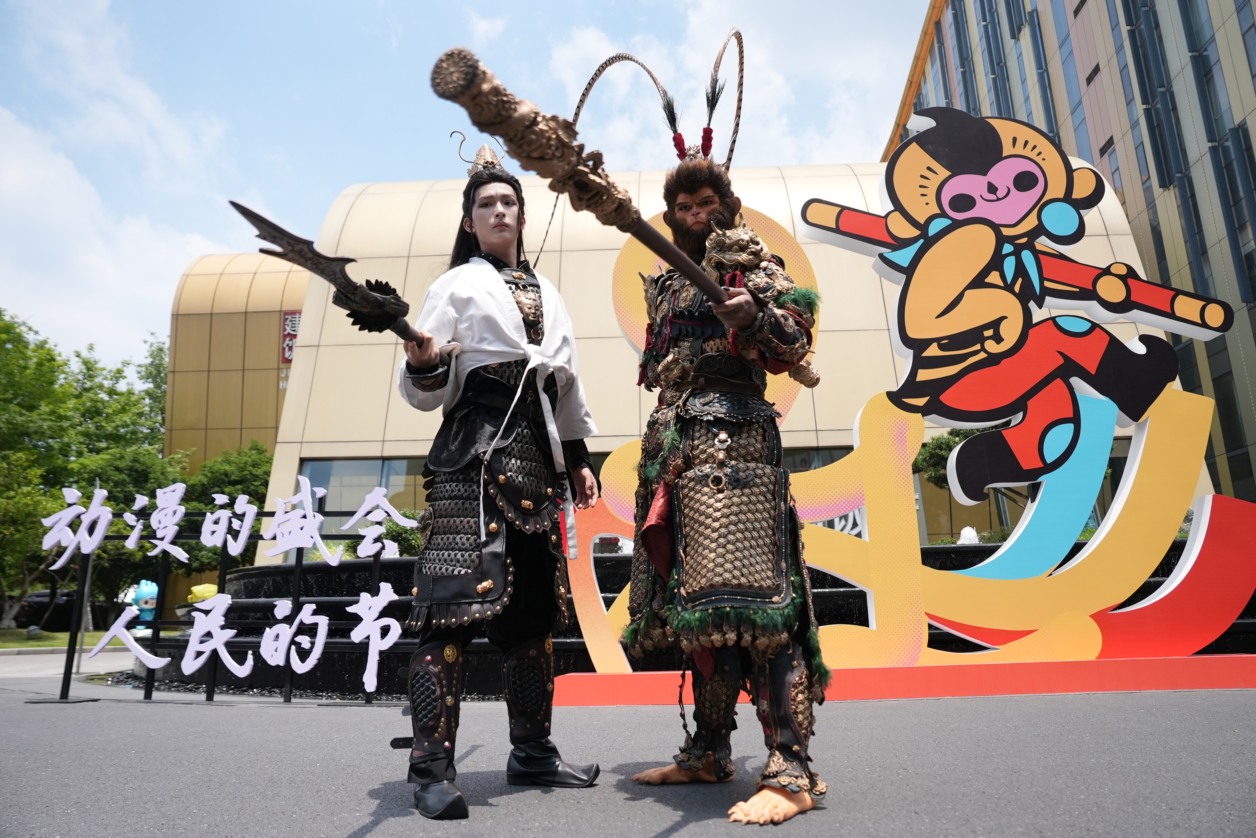 Cosplayers dressed as Sun Wukong (right) and Yang Jian (Erlang Shen) at the 21st China International Cartoon and Animation Festival, Hangzhou, east China's Zhejiang Province, May 29, 2025. /CGTN