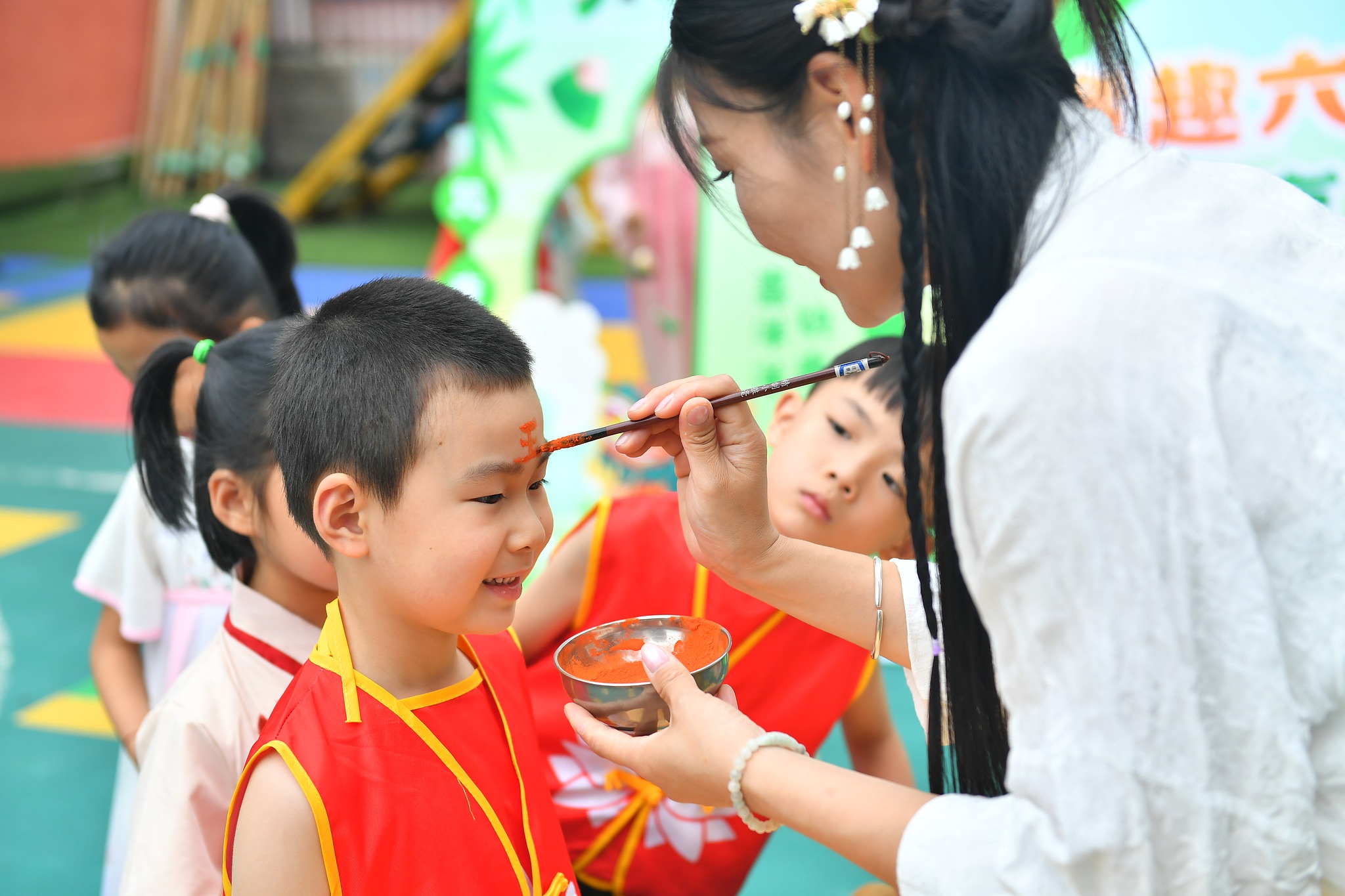 A teacher writes the Chinese character for "king" on a boy's forehead, symbolizing warding off evil and praying for blessings, in Ji'an, east China's Jiangxi Province, May 27, 2025. /VCG