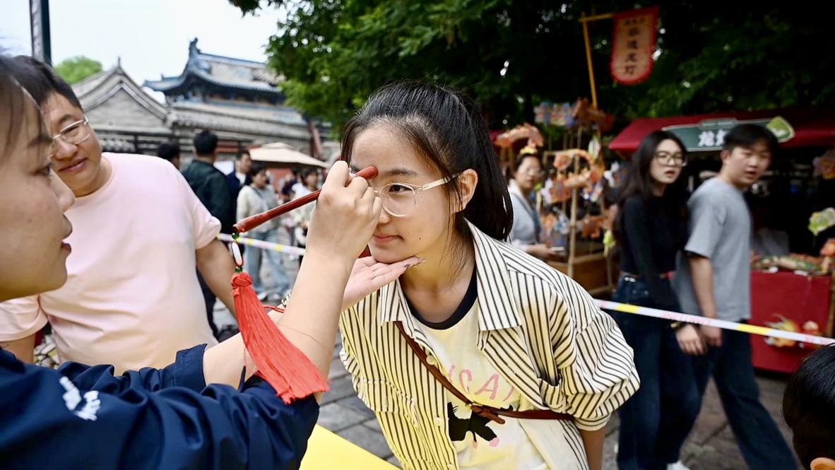 During the ongoing Dragon Boat Festival holiday, visitors to Xinzhou Ancient City in north China's Shanxi Province are taking part in various immersive traditions, including applying cinnabar dots on forehead, weaving five-colored thread bracelets, using calamus leaves to rinse their hands, participating in Zongzi-making contests and tasting yellow rice wine. Each custom carries deep cultural significance, expressing protection from evil and wishes for health and prosperity.