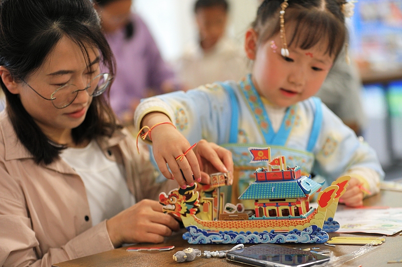 A girl makes a paper dragon boat in Dingxi, Gansu Province, May 31, 2025. /VCG