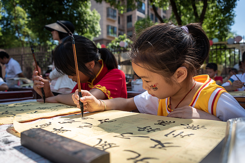 Girls practice Chinese calligraphy at a school in Ji'an, Jiangxi Province, May 30, 2025. /VCG