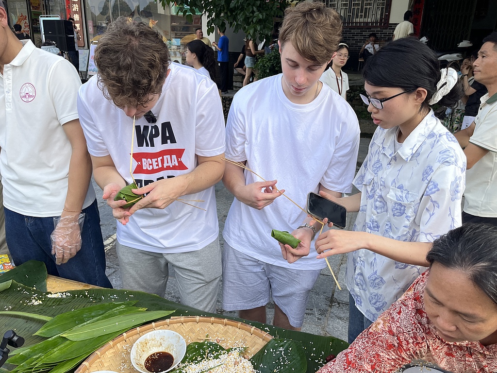 Foreign visitors make zongzi at a scenic spot in a village, Guilin City, south China's Guangxi Zhuang Autonomous Region, May 31, 2025. /VCG