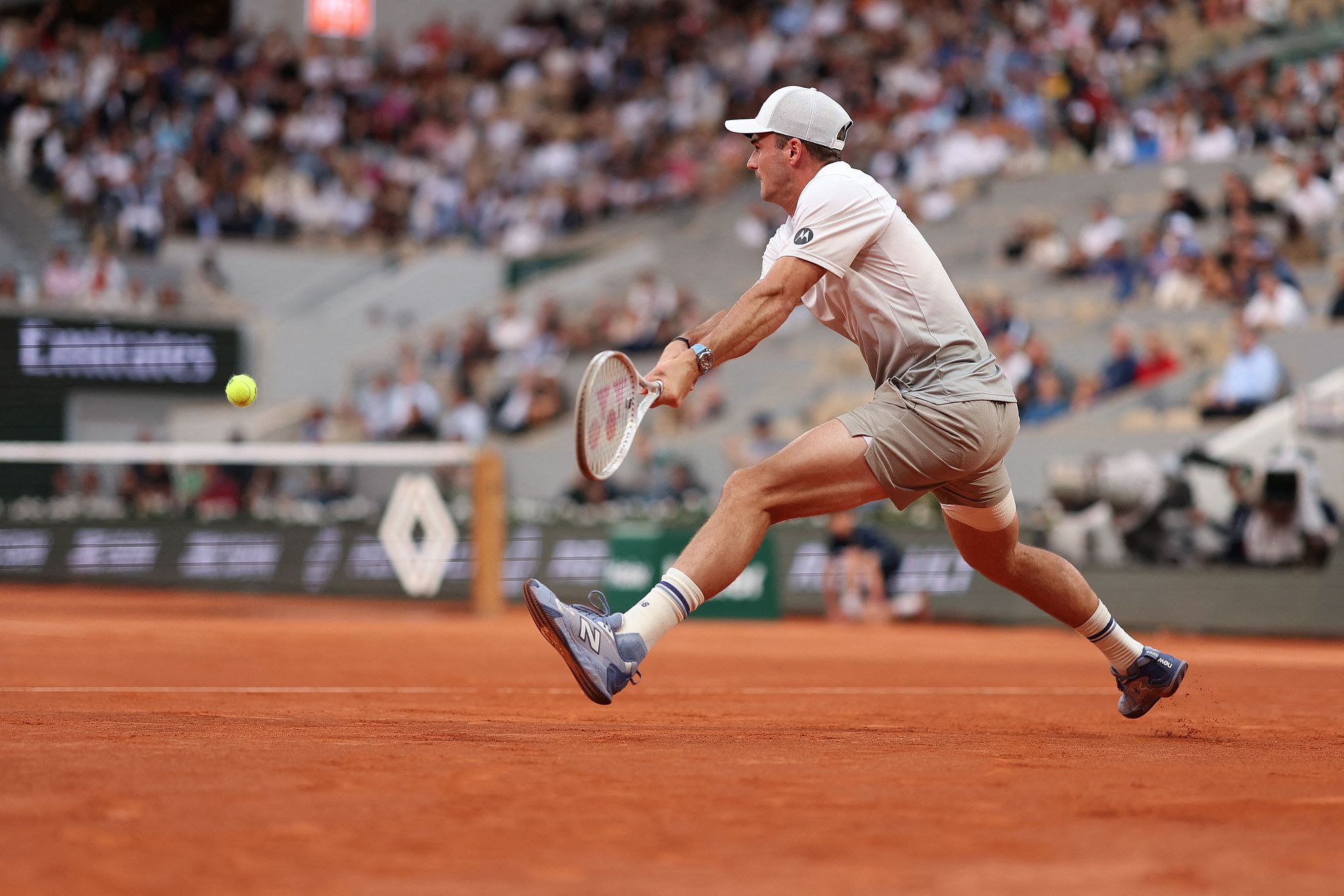 Tommy Paul of the USA hits a shot against Carlos Alcaraz of Spain in a men's singles quarterfinal match at the French Open at Roland-Garros in Paris, France, June 3, 2025. /VCG